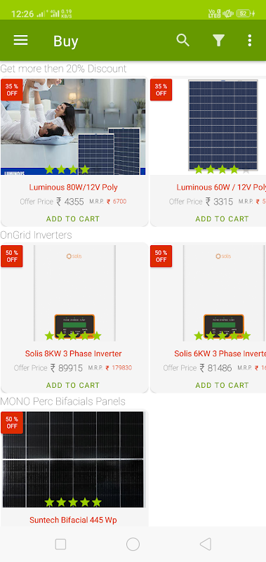Labh Green Energy (LGE) app help you to purchase latest Solar products and help customers to get articles,tutorials and quotations on On grid solar systems . In LGE app you can purchase Solar Panels,Inverters, Balance of Structures, Solar Structure Systems, tools required in installing solar systems.