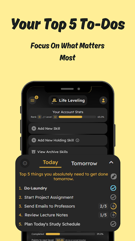 سطح زندگی، وظایف روزمره را به یک سیستم پویا از تلاش ها، عادات و مهارت ها تبدیل می کند - به شما قدرت می دهد تا هر روز پیشرفت ثابتی داشته باشید. چه دانشجو باشید، چه جوان حرفه ای، یا هرکسی که مشتاق ایجاد حرکت است، Life Leveling به شما کمک می کند گام های کوچک را به نتایج بزرگ تبدیل کنید.