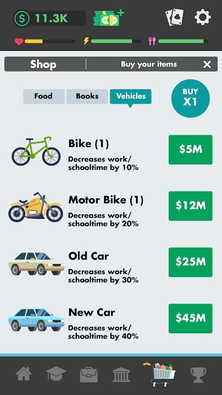 Life Simulator 2 is all about moving up through the world by going to school, getting a job, and eventually running a successful business! Of course, it's also about amassing the most wealth you possibly can. In Life Simulator 2, you can even see how you compare to other players on the leader board and earn achievements based on your progress!
