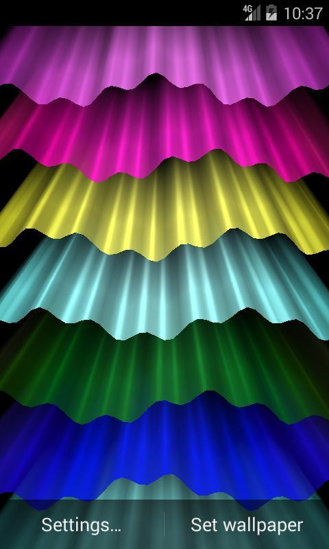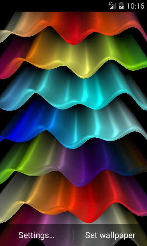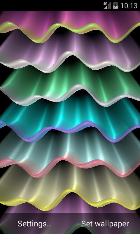 خلاصه زنده تصویر زمینه نمایش امواج رنگارنگ با اثر اختلاف منظر 3D. تخیل شما می تواند تصویر زمینه زنده را در موج نور، و رنگین کمان رنگارنگ، و قوچ دودکش و نور های شمالی تبدیل کند.