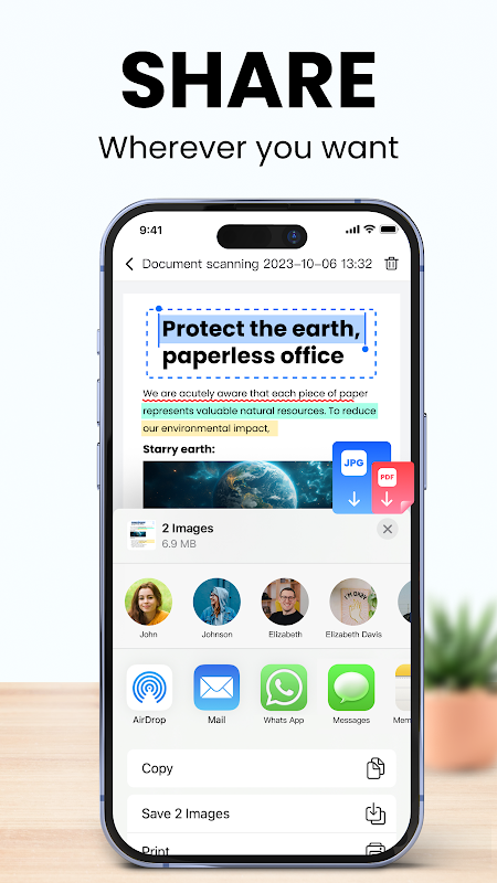 تصاویر اسکن شده PDF یا JPG را می توان با همکاران، شرکا و سایر افراد از طریق WhatsApp، Messenger و سایر برنامه های شخص ثالث به اشتراک گذاشت.