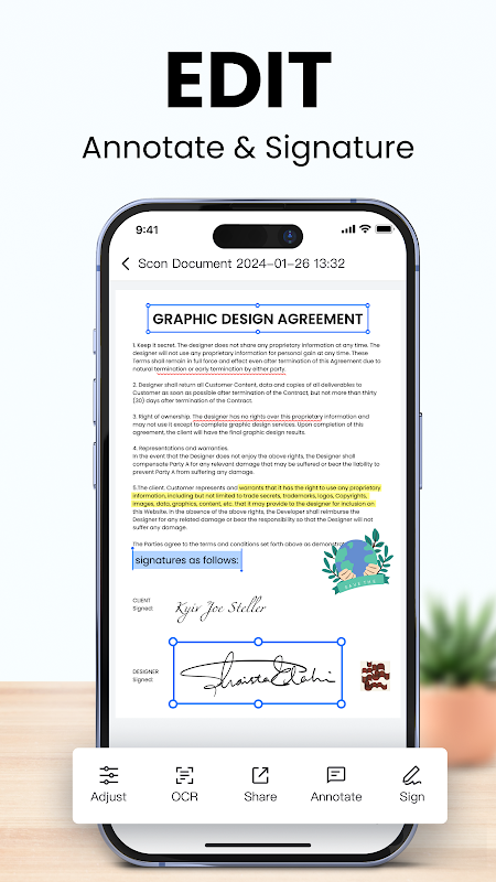 با اسکنر LightPDF، فقط باید تصویر اسناد را بگیرید، برنامه به طور خودکار آن را به فرمت PDF یا JPG اسکن می کند. این برنامه همچنین می تواند (OCR) را تشخیص دهد و متن را از اسکن عکس یا اسکن PDF برای شما استخراج کند و به شما امکان می دهد فایل را با دیگران به اشتراک بگذارید. علاوه بر این، می توانید فایل های PDF را در داخل برنامه امضا کنید. این اسکنر PDF یکپارچه به شما کمک می کند کار را بدون ترک صندلی کامل کنید.