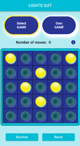 وظیفه بازی خاموش کردن تمام دکمه های روشن است. پس از فشار دادن دکمه، چراغ برای دکمه و همسایه های عمودی و افقی آن روشن/خاموش می شود. تنظیمات از پیش تعیین شده در بازی وجود دارد، یا می توانید پیکربندی خود را تنظیم و بازی کنید. این بازی برای تخیل بسیار سخت است و بنابراین تنظیمات از پیش تعیین شده ساده تر هستند. راه حل بهینه را می توان برای هر پیکربندی قابل حل نمایش داد.