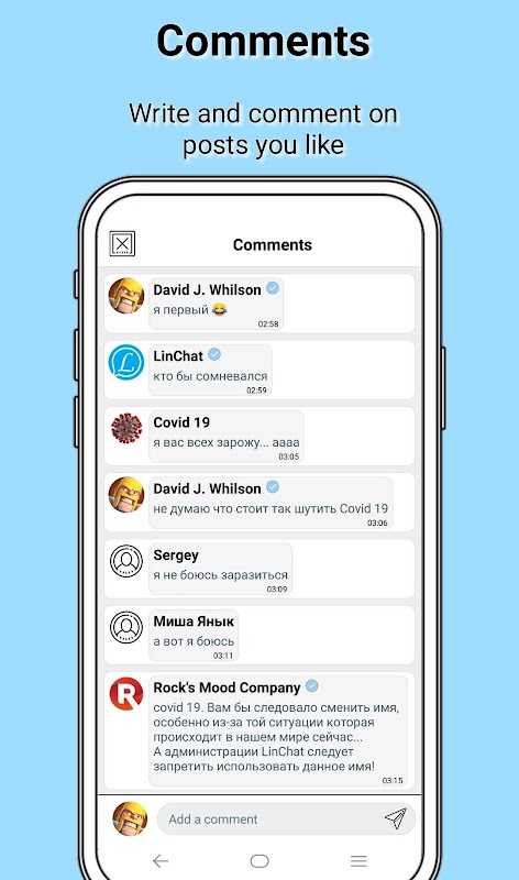 LinChat App is a social network where you can talking with friends, create thematic communities, making new acquaintances and much more. LinChat combines everything that is needed for an interesting leisure. This is an ideal place to: - watch videos and photos of friends and favorite bloggers; - listen to music (wait for update); - make dating for free. LinChat has many opportunities for communication. Create a two-person chat or shared chat with several people to keep in touch with loved ones. Messages will always accurately convey your emotions thanks to stickers. Try LinChat App messages and you will no longer need other messengers to communicate. Express yourself and draw attention to your creativity: create groups and place your own in them
