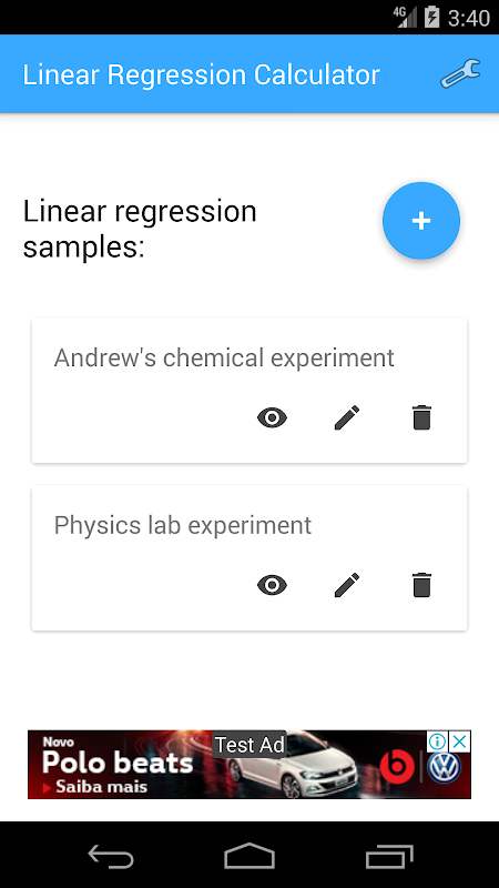 This application allows you to create several samples and, in each one, you just have to add the points (X and Y pairs) and the application will calculate all for you. It’ll calculate the A (inclination) and B (intersection), and you can even see the graphic plot with the points and the adjusted line.
