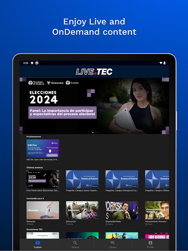 از محتوای زنده از Tecnológico de Monterrey که توسط مدارس، رویدادها، موسسات و ابتکارات تولید شده است، از جمله فارغ التحصیلی دبیرستان، حرفه ای و تحصیلات تکمیلی لذت ببرید. و همچنین محتوای OnDemand در مورد کارآفرینی، آموزش، شکوفایی انسان، رفاه، سلامت، نوآوری، فناوری، اکوسیستم Tec و غیره.
