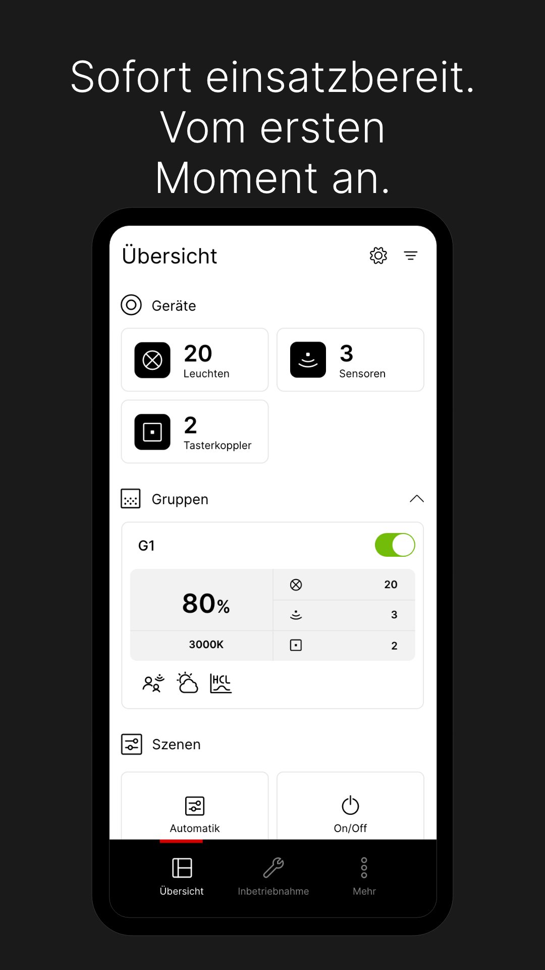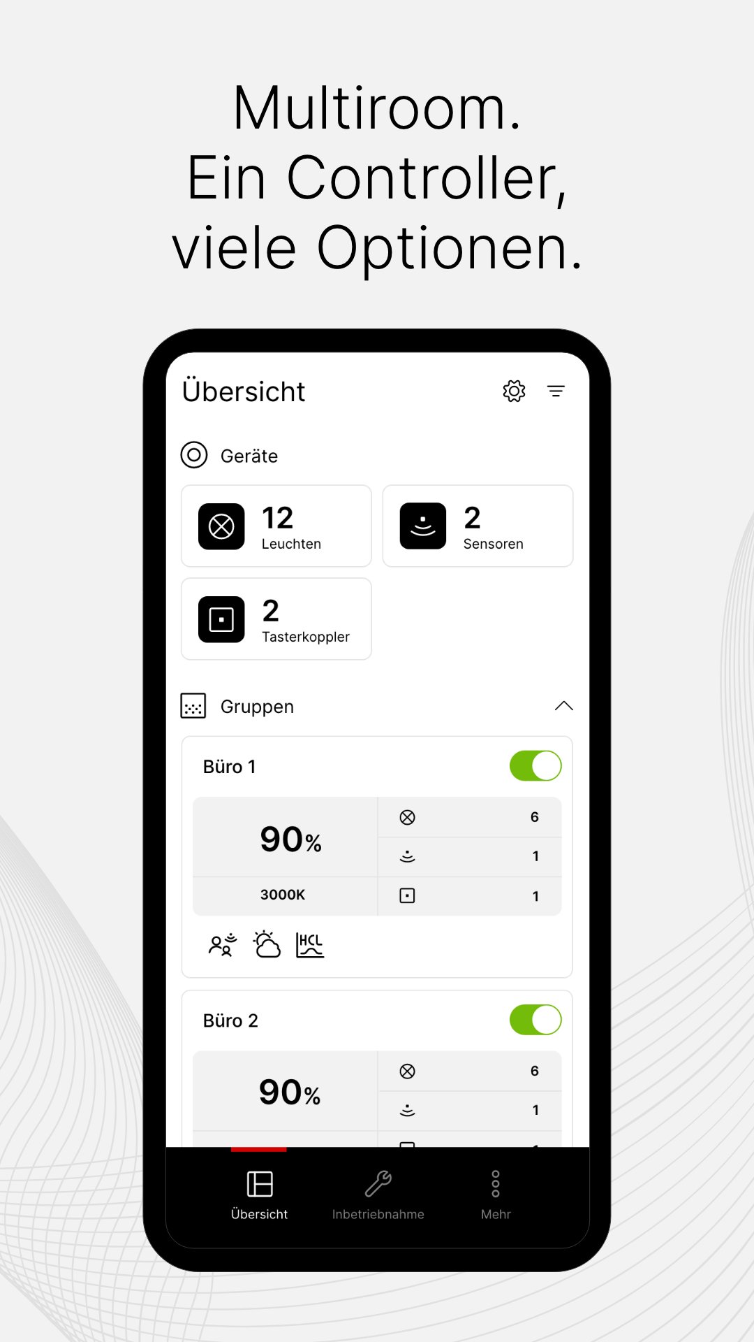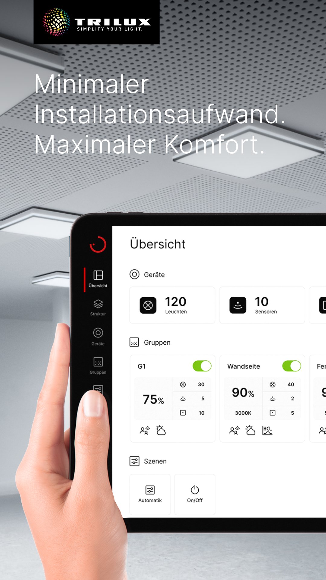 LiveLink از همان ابتدا عملیاتی و کاملاً کاربردی است. همه شرکتکنندگان سیستم بهطور خودکار شناسایی میشوند، عملکردهای حسگر مانند تشخیص حرکت و کنترل نور ثابت از قبل پیکربندی شده و فعال هستند، دکمههای متصل روشنایی را روشن و کمنور میکنند. اگر نورپردازی شامل لامپ های سفید تنظیم شونده باشد، منحنی TRILUX HCL قبلاً فعال شده است.