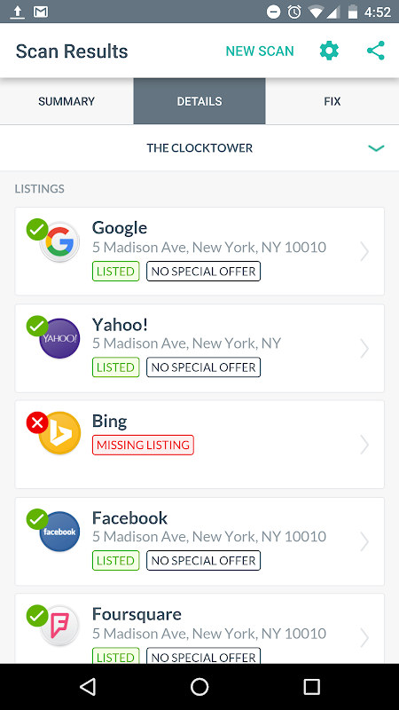 محل سکونت اسکن سریع ترین راه برای بازاریابان حرفه ای، سئو و SEMS به نشان می دهد چشم انداز محلی و مشتریان چگونه موقعیت خود را در هر ملک مصرف کنندگان عمده به نظر می رسد است. به سادگی باز کردن محل سکونت اسکن، و انتخاب محل شما می خواهید به اسکن. بلافاصله ببینید که چگونه محل به نظر می رسد در گوگل، Yelp، فیس بوک، و بیش از 100+ دیگر برنامه های پیشرو، دایرکتوری ها، و خدمات نقشه برداری. خلاصه که تجزیه و تحلیل خطاهای داده های مکان و مته به جزئیات خاص توسط ناشر را مشاهده کنید. به راحتی نتایج اسکن محل با چشم انداز و مشتریان خود را از طریق پست الکترونیکی و یا متن به اشتراک بگذارید، به طوری که آنها دریافت گزارش دائم چگونه آنها را از شما نگاه کنید. محل سکونت اسکن یک ابزار 100٪ رایگان برای نفع مشتریان خود را به بازاریابی حرفه ای و جامعه SEO محلی ارائه شده توسط Yext است.