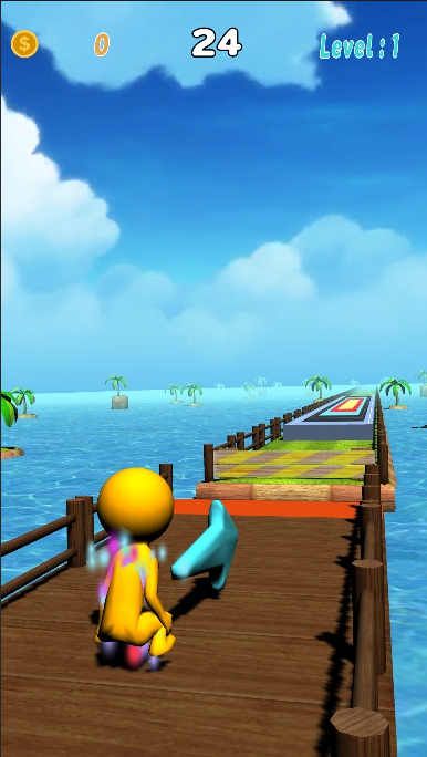 Will tap the screen once to make the character run forward Then tap one more time to change the degree of the jump and press one more time to jump.