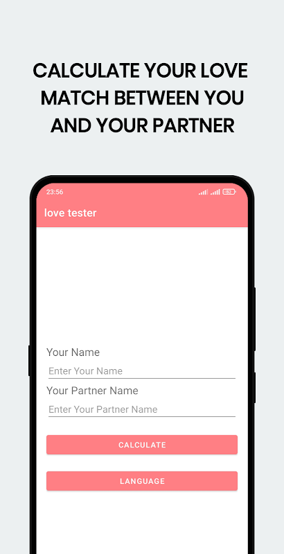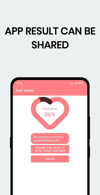 برنامهای که درصد عشق بین شما و شریک زندگیتان را اندازهگیری میکند، جایی که نام خود و نام شریکتان را وارد میکنید، به طوری که برنامه درصد عشق بین شما را محاسبه میکند و نتیجه را در جایی به دست میدهد که نتیجه آن درصد مشخصی است با اطلاعات اضافی در مورد رابطه عشقی بین دو طرف، برنامه فقط برای سرگرمی است و نتیجه را می توان با معشوق خود به اشتراک گذاشت