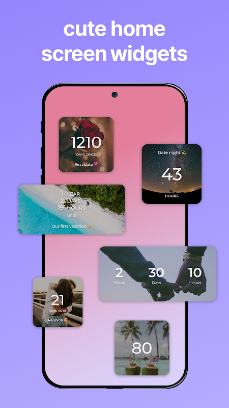 ویجت های رابطه زیبایی شناسی را برای صفحه اصلی خود ایجاد کنید. از میان طرحبندیها، سبکها و اندازههای مختلف برای مطابقت با موضوع خود انتخاب کنید. «روزهای با هم» یا «شمارش معکوس اتحاد مجدد» شما 24/7 قابل مشاهده است.