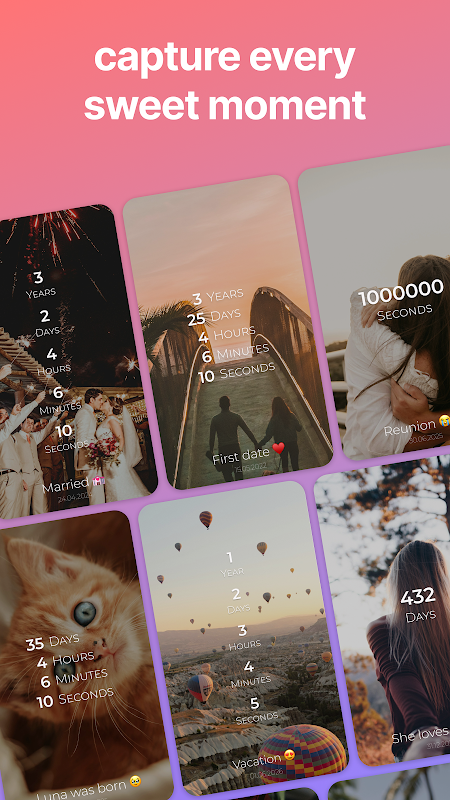 مدت زمانی که با هم بودید و تمام روزهای عشق خاص خود را - از اولین بوسه یا اولین قرار تا سفر بعدی، سالگرد یا ملاقات مجدد - در سال، ماه، روز، دقیقه یا حتی ثانیه پیگیری کنید.