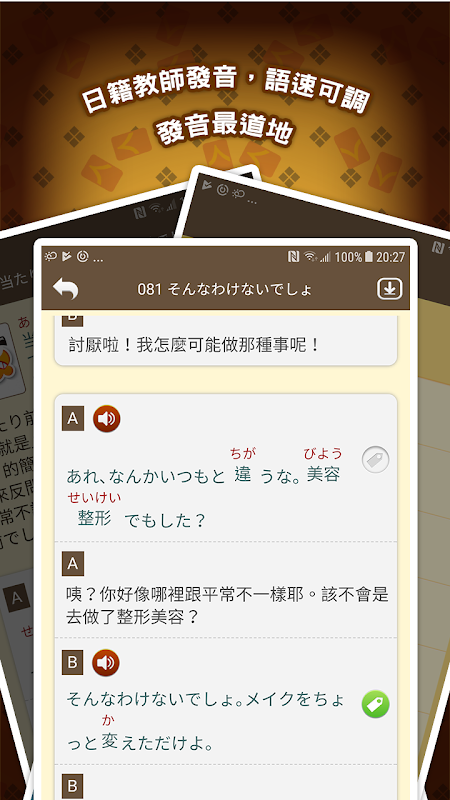 * 由日籍教師以常速錄音,可選擇整段對話連播或點選單句聆聽。亦有重播及調整語速功能,學習者可配合程度反覆聆聽每句用語及對話的發音語調。另外,提供學習者錄音功能,可比較和日籍錄音教師的差異,改進自己的錯誤發音。