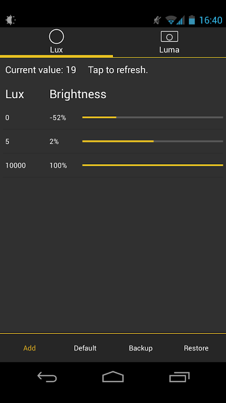 Give it a go! I want you to test Lux for more than the 15 minute refund period offered by Google. I understand that some devices may not have the best quality light sensor, and that you may need more time to play around with settings. If you find that Lux doesn't suit you after the 15 minutes is up, you can request a refund within a week of purchase via e-mail - no questions asked.