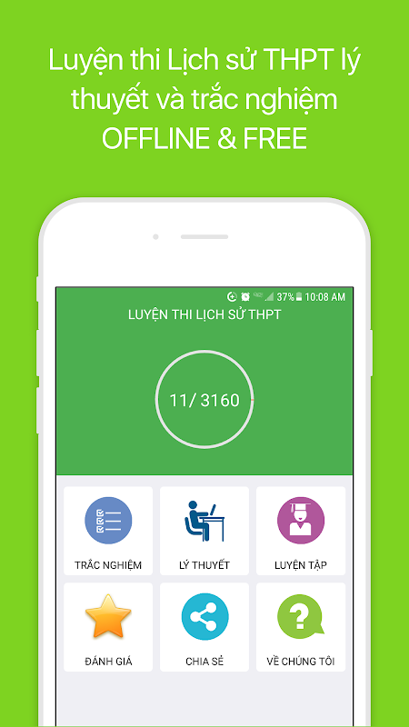 Ứng dụng Luyện thi Lịch sử Trắc nghiệm và Lý thuyết THPT 10, 11, 12 tổng hợp đầy đủ các bộ đề luyện thi mới nhất 2018 hoạt động Offline, và hoàn toàn miễn phí(Free)