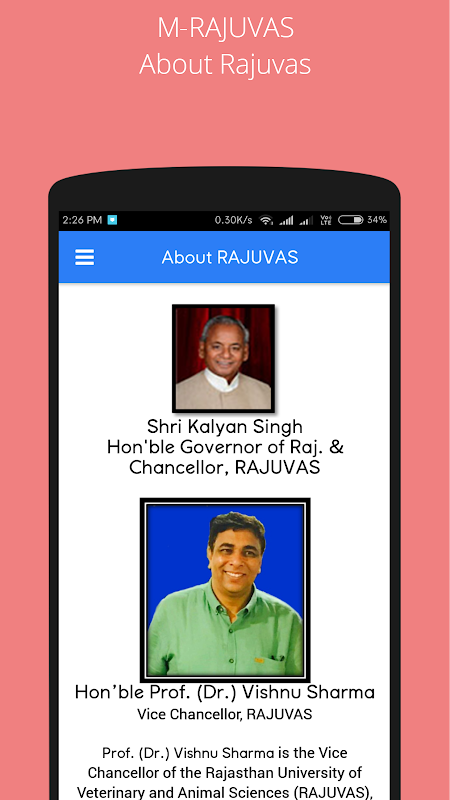 This M-RAJUVAS Android Educational Mobile Application is available for free download at the Google Play store. The application includes several features like m-content for the Syllabus of Animal Husbandry Diploma Program (A.H.D.P), Bachelor of Veterinary Science and Animal Husbandry (B.V.Sc & A.H.), Master of Veterinary Science (M.V.Sc) to meet the needs of students (m-learning) and the m-content for the Farmers/Livestock Owners in the form of Pashupalako ke liye Upyogi Samagri (पशुपालको के लिए उपयोगी सामग्री). Contents under M-RAJUVAS Mobile App. for B.V.Sc.& A.H. and M.V.Sc. are being provided in English Language for the Veterinary Students and contents for A.H.D.P. & Pashupalako ke liye Upyogi Samagri are being provided in Hindi Language as per its utility.