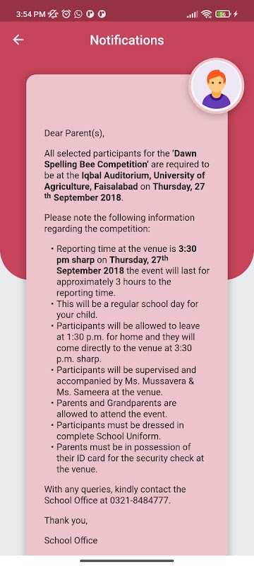 the parent can see all his attendance, see new notices , exam results , homework , Time table , Fee challans , events etc.
