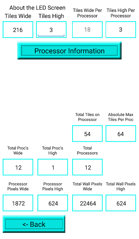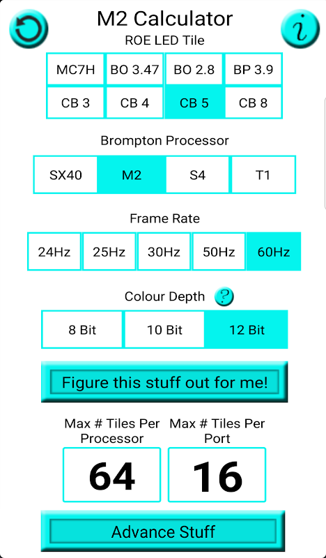 من این نرم افزار را برای Techs و PM's I کار کردم تا بتوانند برای صفحه های ساده LED ببینند که تعداد پردازنده های M2 ، S4 یا T1 برای یک نرخ فریم و عمق رنگ مورد نیاز برای نمایش چیست.