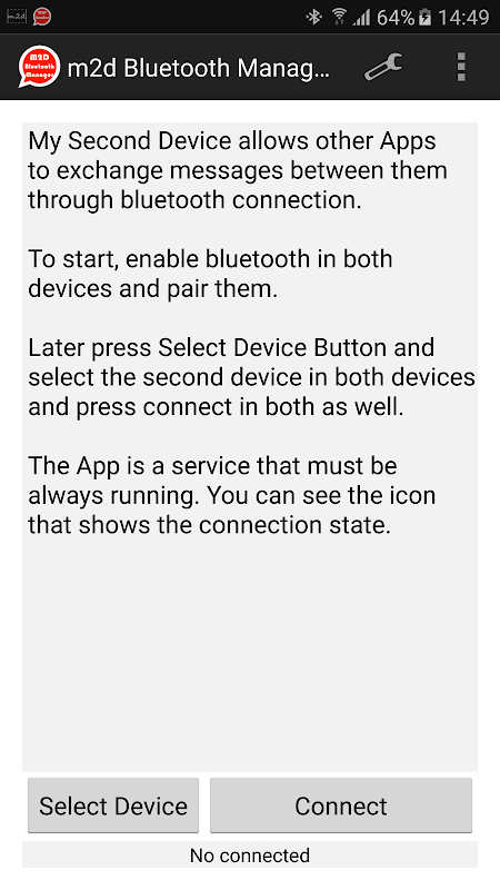My Second Device allow other Apps to exchange messages between them through bluetooth connection.