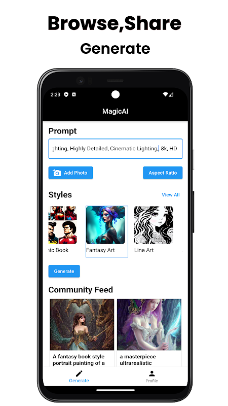 کتابخانه وسیعی از آثار هنری که توسط کاربران دیگر ساخته شده و اعلانهایی که خلاقیت آنها را برانگیخته است را کاوش کنید. با موتور قوی Hyper Real AI MagicAI، طرح های هنری شبیه به خودتان را کشف کنید و درخشش هنر تولید شده توسط هوش مصنوعی را به نمایش بگذارید.