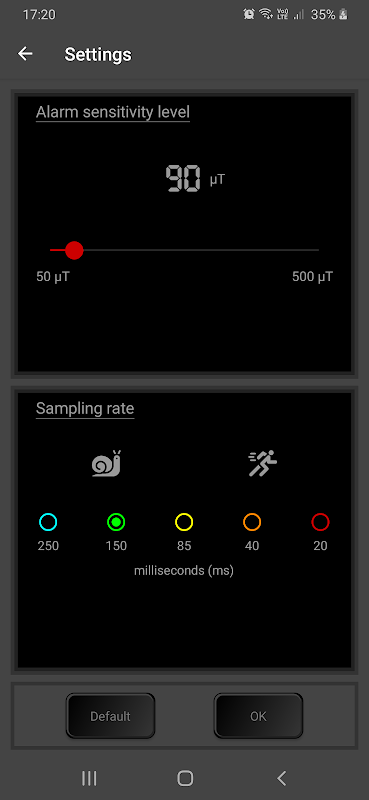 حساسیت هشدار را با کلیک کردن روی خواندن تغییر دهید و نوار جستجو را برای تنظیم انگشت بکشید.