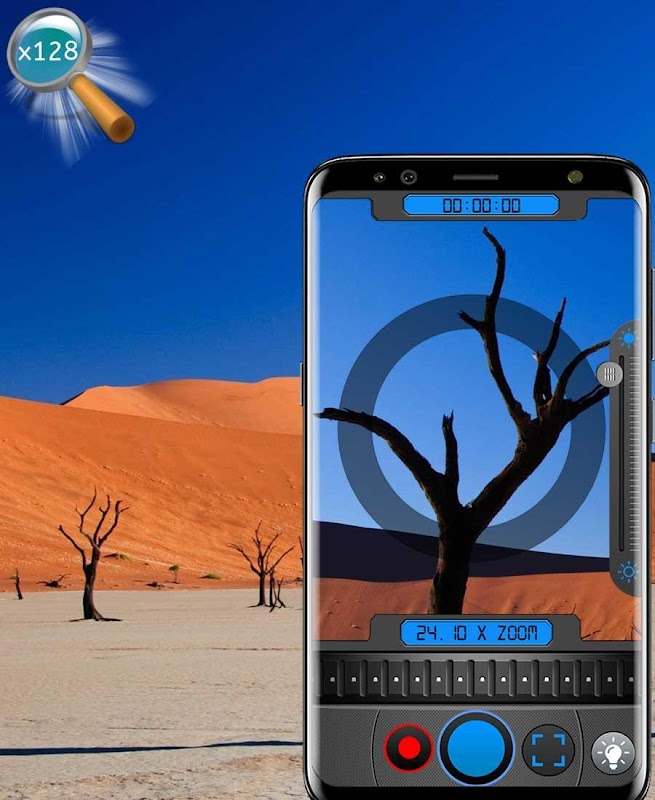 Magnifying Glass with Flashlight-Magnifier Zoom is the best application to bring far objects or person near to the camera you can zoom a lot more than you can imagine for a normal phone camera depends on the default built-in camera quality