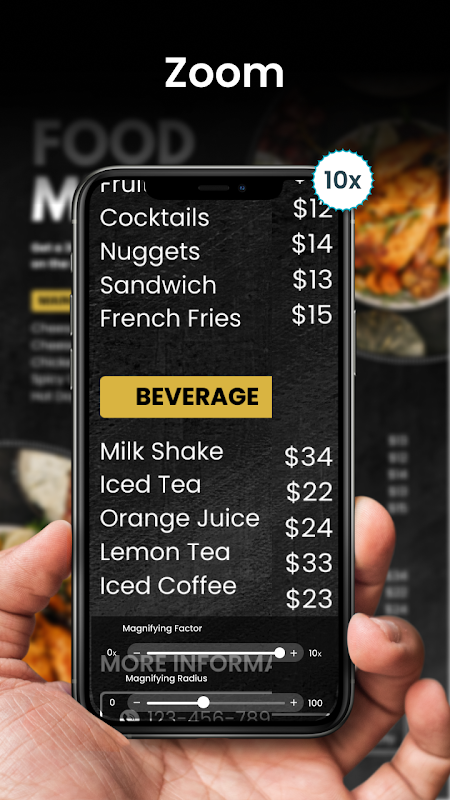 Play. دوربین ذره بین، ذره بین دیجیتال، خواننده منوی رستوران و هر نسخه خوان روی بطری های دارو.
