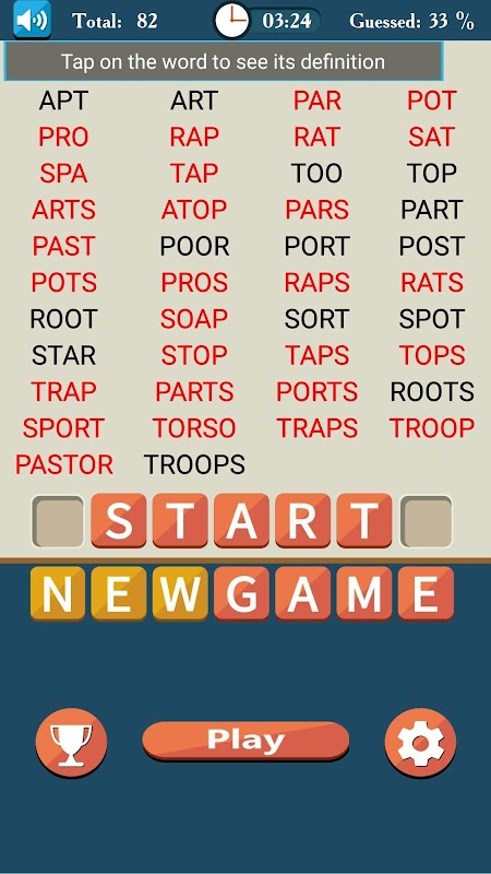 وقتی کلمه ای را حدس می زنید، برای جستجوی کلمات پنهان دیگر، امتیاز و زمان بازی اضافی دریافت می کنید. اگر برخی از کلمات را باز کرده اید و نمی توانید چیز دیگری را حدس بزنید، می توانید دکمه "تسلیم شدن" را فشار دهید و تابلوی حاوی کلمات پنهان باز می شود. کلماتی که حدس زده اید با رنگ قرمز مشخص شده اند. اگر کلمه برای شما ناآشنا است، میتوانید روی کلمه ضربه بزنید تا تعریف آن را ببینید.