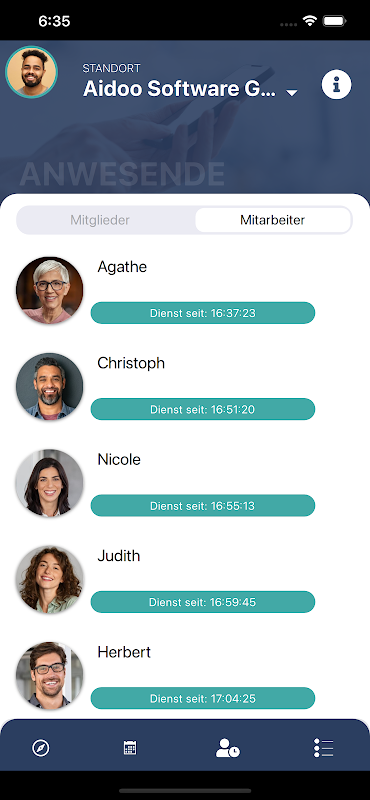 کارمندان می توانند به راحتی ساعات کاری خود را ثبت کنند، مربیان می توانند قرار ملاقات های خود را با اعضا تماس بگیرند و ویرایش کنند. امروز چه قرارهایی در راه است؟ آیا هفته از قبل پر است یا به طور مطلوب رزرو شده است؟ با کلیک بر روی نماد قرار، تقویم خود را مستقیماً فراخوانی می کنید. سپس تمام اطلاعات مهم قرار ملاقات در نمای دقیق قابل مشاهده است: مدت زمان قرار ملاقات، اطلاعات مهم در مورد قرار ملاقات و عضو و همچنین اطلاعات عضو با عکس و موارد دیگر. نگاهی به اپلیکیشن شرکت نرمافزار Aidoo نیز مستقیماً مشخص میکند که در حال حاضر چه کسانی در استودیو حضور دارند، البته با جزئیات، تا قرار ملاقات مستقیم نیز امکانپذیر باشد.