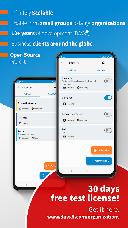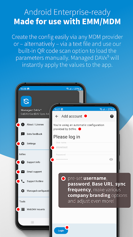 مدیریتشده DAVx5 دارای همان قابلیتهای هماهنگسازی عالی مانند DAVx5 اصلی است، اما دارای ویژگیهای اضافی عالی برای مشاغل و سازمانها است. هدف اصلی این نسخه برای کارکنان سازمانی است که میخواهند CalDAV و CardDAV را در دستگاههای Android در دسترس داشته باشند. DAVx⁵ مدیریت شده باید توسط یک سرپرست از قبل پیکربندی شده باشد. این را می توان در عرض چند دقیقه انجام داد - و نیازی به برنامه نویسی نیست!