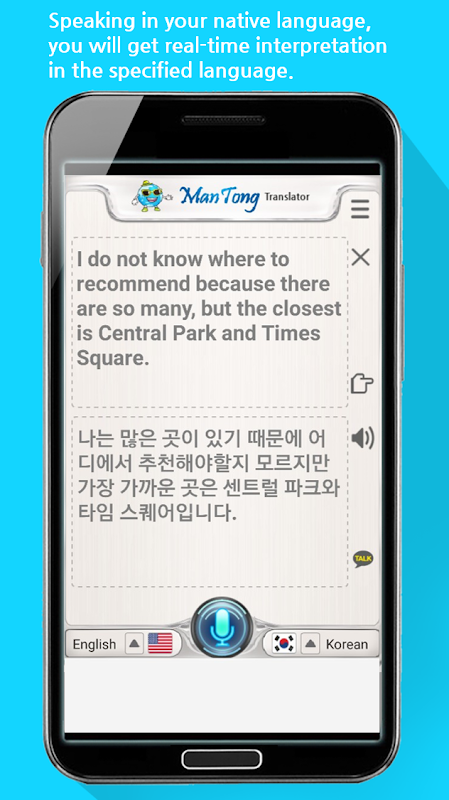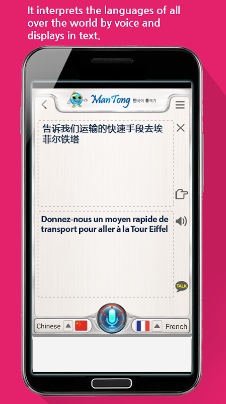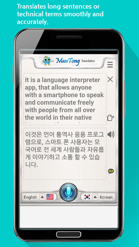 It is a multi-language interpreter app (app) that allows anyone to speak and communicate freely with people from all over the world in their native language with a smartphone. If you select the language you want to translate and speak it in your native language, it will be translated and spoken.