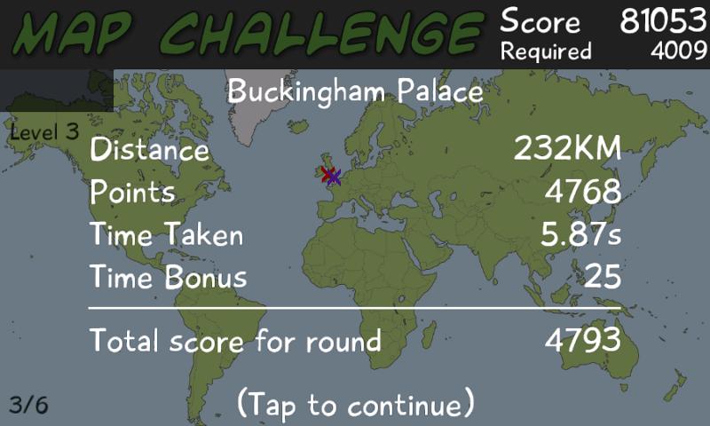 Test your geography with Map Challenge! Locate various cities and landmarks on the map as quickly as you can. Includes 3 level packs: World, Europe and North America, which you can play on either Easy Medium or Hard.