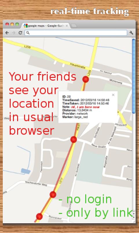 شما دوستان می توانید آهنگ خود را مشاهده و دنبال شما در زمان واقعی در مرورگر معمول، نرم افزار خاص و یا ثبت نام در سرویس های شخص ثالث لازم نیست. استفاده از نقشه به عنوان آهنگ ردیاب آنلاین و آفلاین شخصی شما. مدیریت آهنگ های آنلاین خود را به عنوان سند معمول در Google Drive خود. شما همچنین می توانید داده های خود را به عنوان یک فایل KML یا تصویر صادرات.