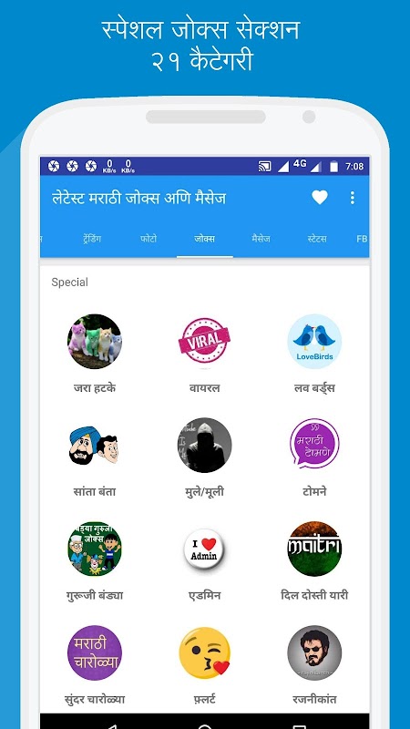 With more than 22000+ Jokes,messages, status, DP status and funny photo. it contains the largest collection of Marathi jokes. Along with this there are 65 different categories, which is as follows: