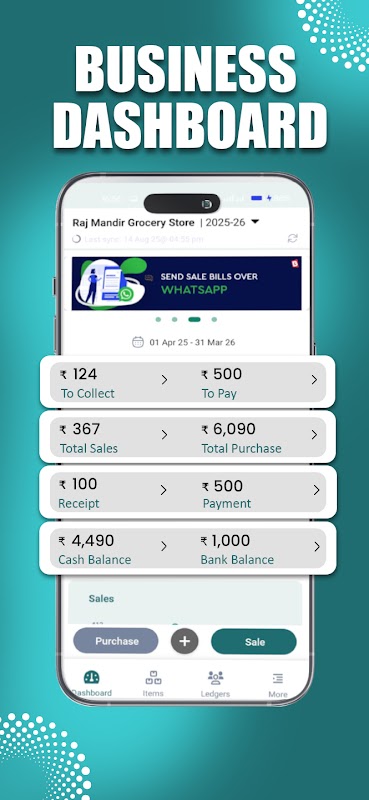 فاکتورهای منطبق با GST ایجاد کنید، دفاتر کل را مدیریت کنید و موجودی کالا را به صورت آنی پیگیری کنید، همه اینها را از طریق تلفن همراه خود، بدون نیاز به چاپگر یا کامپیوتر رومیزی انجام دهید. حتی میتوانید صورتحسابها را مستقیماً از طریق واتساپ ارسال کنید! با یک داشبورد تحلیلی تجاری واقعاً قدرتمند، همیشه کنترل عملیات خود را در دست خواهید داشت.