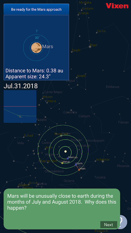 این به شما نشان می دهد که چرا رویکرد Mars Close رخ خواهد داد ، و با استفاده از تصاویر متحرک و نمودارهای ستاره در یک منظره از فضای بیرونی ، به آسانی توضیح داده می شود.