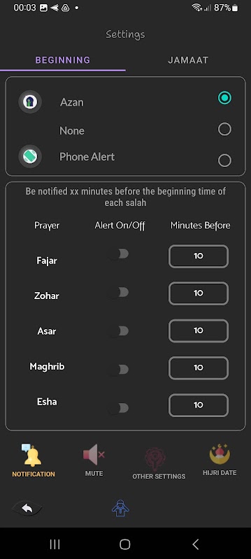 همچنین میتوانید قبل از زمان جماعت هشدارها را تنظیم کنید و همچنین میتوانید گوشی خود را به صورت خودکار بیصدا کنید.