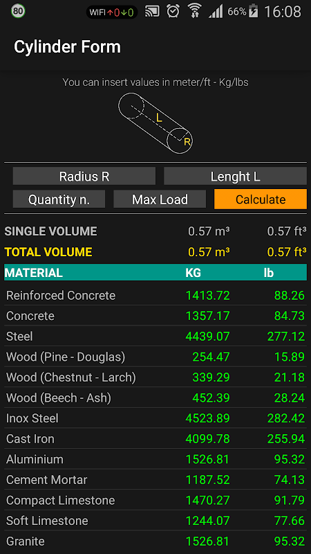 the app will give you the volume of the single beam, the total volume, and the total load. If you put the volume quantity = 1, and the load is a single beam or floor etc.