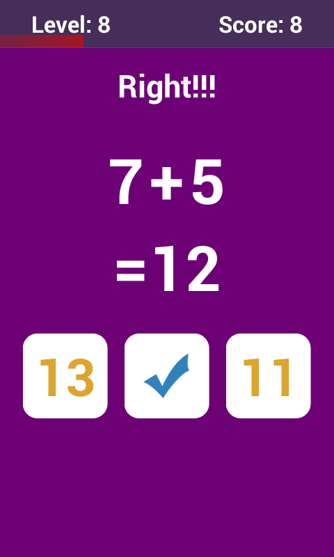 Math Challenge is an addictive math calculation game. It's suitable for kids 5 years old to 12 years old or maybe you because it's a challenge mode with just only 1 second to think about the correct answer and also challenge with your friend's score. It's very addicted game.