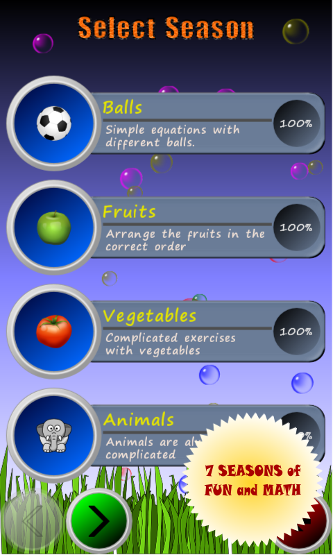 There are seven seasons available. Each season have a different degree of difficulty of math equations. Your brain will love all of them.