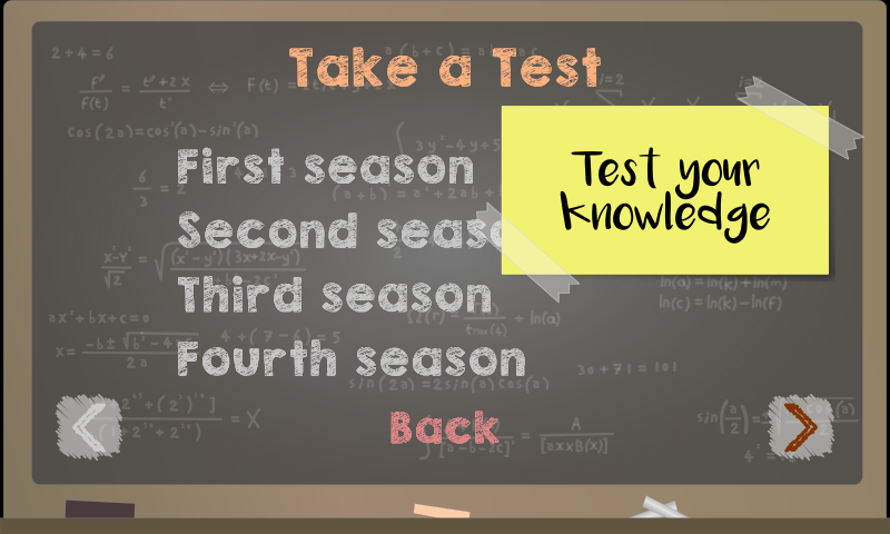 There are seven seasons available with more than 100 math exercises each. Also there is a quick test mode where you can solve 10 math exercises and receive a grade. The entire testing process is presented in a fun and interactive way that all kids will enjoy.