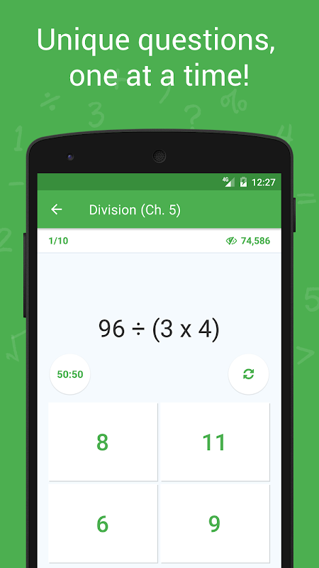 آزمونها/معماهای ریاضی تصادفی منحصر به فردی بسته به سطح دشواری فصل به شما ارائه میشود. میتوانید در هر بازی یک سوال را برگردانید یا تغییر دهید.