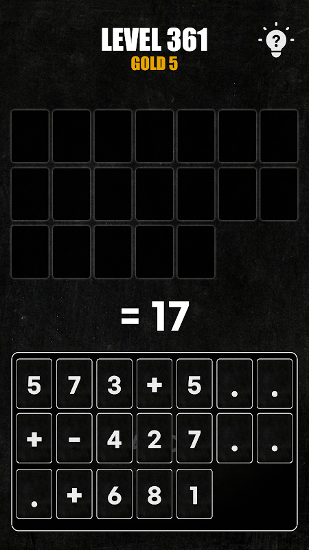 کارت های اعداد داده شده را در شکاف های خالی قرار دهید تا معادله کامل شود و پازل حل شود. از مسائل ساده ای مانند "2 + 3 = 5" تا معادلات بسیار پیچیده مانند "9.64 / 4.23 + 3.11 * 1.1 - 0.5 = 6.65 / 1 - 1.43"، مقیاس دشواری برای بالا بردن محدودیت های شما.
