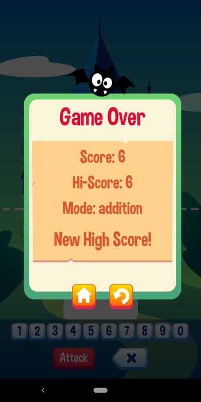 a nice game that helps you increase your concentration, the bats begin to descend and you have to solve the mathematical equations in order to shoot the bat, you have three attempts if the bat crosses the line you lose one attempt and when you lose three attempts you replay the game, The more bats you kill the more the game gets harder and faster, the game is educational and fun that helps you learn math and strengthen your concentration, download the game for free on Google Play and enjoy.