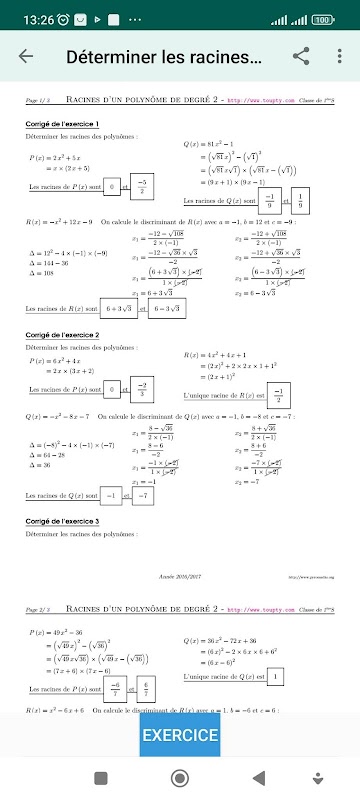 exercises with corrections, exercises devoted to part of the mathematics program of first S. The exercises present on this page concern the equations and polynomials of the second and third degree, the concept of derivative and direction of variation of a function as well as the study of arithmetic and geometric sequences. More precisely, the first two series of exercises are devoted to determining the roots of a polynomial of degree 2 and to solving quadratic equations. In the following two series, you will find exercises on the factorization of polynomials of the second and third degree. Exercises on functions aim to review the notion of derivative of a function which is directly linked to the notion of tangent to a curve (graphic reading exercises) as well as to the meaning of variation of the function studied. The last series of exercises aims to become familiar with the calculation of the terms of an arithmetic or geometric sequence.