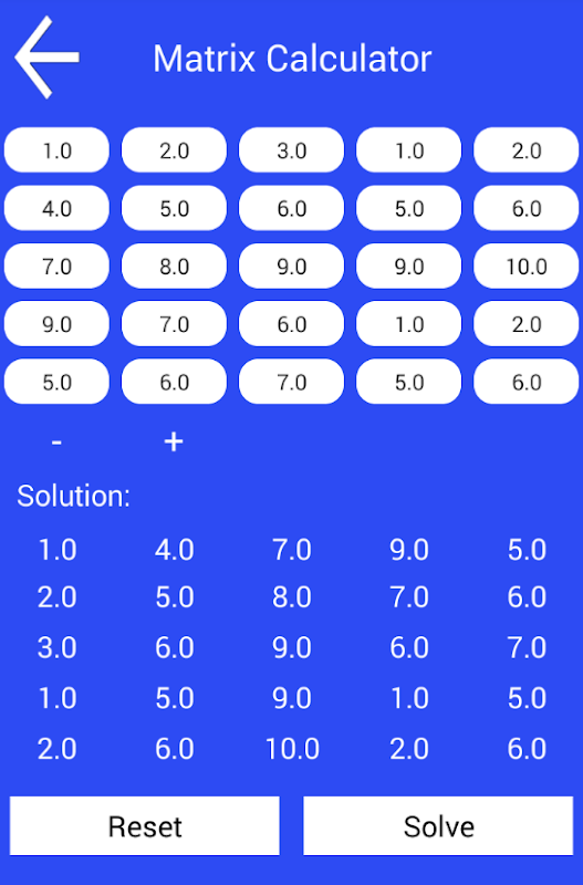 Matrix Calculator is a tool that makes working with matrix's easy. Simple select the matrix operation you want done, adjust the size of the matrix with the values you want, and press solve. Matrix Calculator will do all the calculations for you. In addition matrix calculator will remember your last calculation so you can come back to it between sessions.
