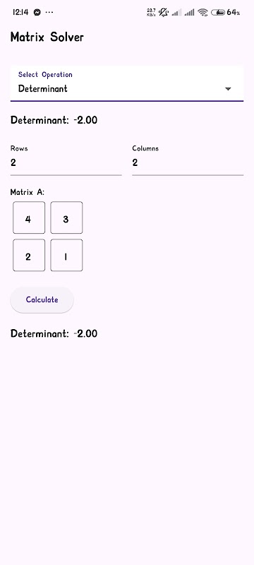 Matrix Solver طیف وسیعی از اندازههای ماتریس را پشتیبانی میکند، از ماتریسهای کوچک ۲×۲ تا ماتریسهای بزرگتر، که آن را به اندازه کافی همه کاره برای رسیدگی به انواع مختلف مسائل ماتریس میکند. چه در حال حل معادلات خطی باشید، چه بر روی تکالیف درسی کار کنید یا با محاسبات پیچیده در یک محیط حرفه ای سر و کار داشته باشید، این برنامه به شما اجازه می دهد تا ماتریس هایی با هر اندازه ای را وارد کنید و فوراً نتیجه بگیرید. رابط برنامه به گونه ای طراحی شده است که ساده و کاربرپسند باشد و به شما امکان می دهد مقادیر ماتریس را به راحتی وارد کنید و عملیاتی را که می خواهید با کمترین تلاش انجام دهید انتخاب کنید.
