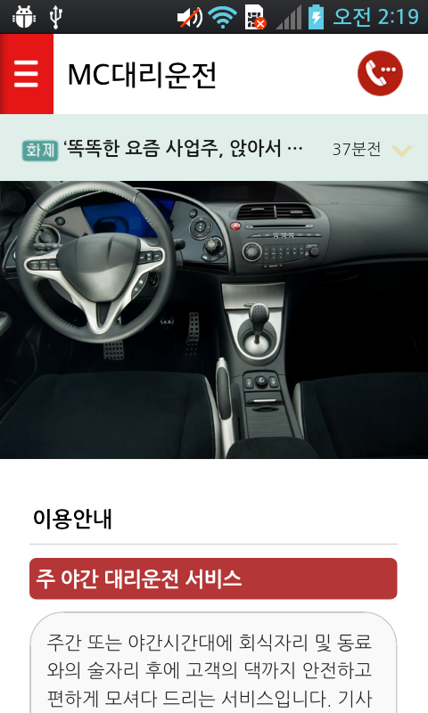 MC대리운전 앱에서는 업체소개, 요금안내, 문의하기, 갤러리 등을 이용하실 수 있습니다.