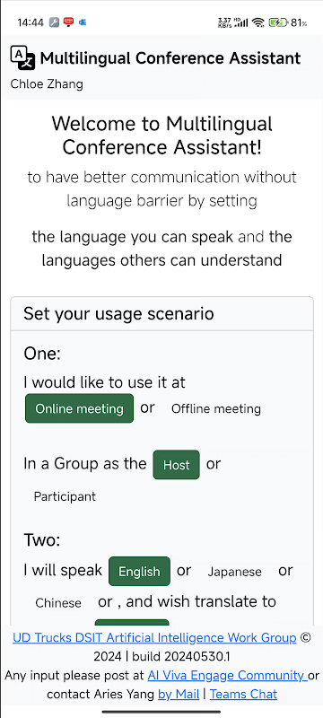 MCA (دستیار کنفرانس چند زبانه) یک ابزار ترجمه است که توسط کاربران داخلی شرکت استفاده می شود. می تواند مکالمات جلسه و مکالمات آفلاین ما را به چندین زبان ترجمه کند تا به ما کمک کند یکدیگر را بهتر درک کنیم.
