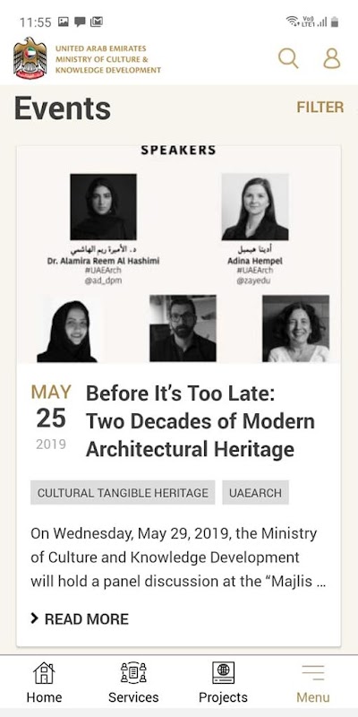 برنامه تلفن همراه وزارت فرهنگ و جوانان در امارات متحده عربی خدمات متنوعی را ارائه می دهد که به نفع شهروندان و ساکنان این ایالت است و به همراهی راهپیمایی پیشرفت فرهنگی و دانش کمک می کند.